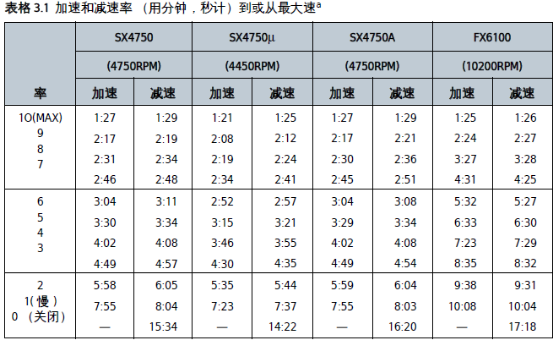 轉子會以**大速率加速**設置轉速,短暫維持運行(一旦按下鍵)。松開鍵時,則啟動**大減速率。 |